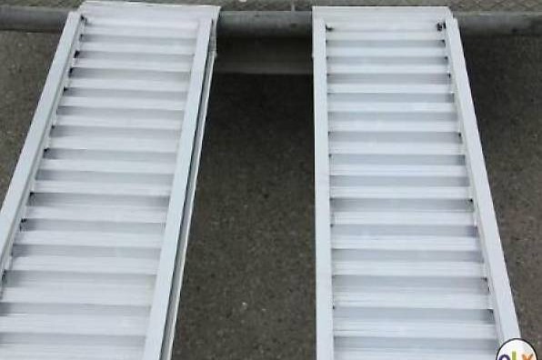Aluminium-Auffahrrampen NEU, M100/45, Totallänge 450cm, Aussenbreite 36cm, Innenbreite 30cm. Nach UNI-Norm Nr. 8634. Rampen sind mit seitlichem Schutzrand und rutschsicherer Fläche versehen. Belastung pro Paar bei Achsabstand (von der vorderer Achse zur Hinteren) von 100 cm 1000 kg, 125 cm 1075 kg und 150 cm 1165 kg. Oben befindet sich eine Auflagezunge und unten ein Anfahrkeil. Zur Sicherung wird eine Lasche mitgeliefert, die an der Auflagezunge eingeschoben wird.