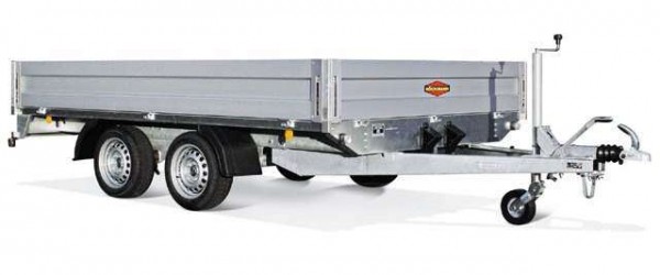 Tandemachser mit wartungsfreien Gummifederachsen, Auflaufbremse mit Rückfahrautomatik, V-Deichsel, 50mm Kugelkupplung, Stützrad, 2 Radkeile. Wetterfester Siebdruckholzboden, 6 Binderinge im Boden, Aluseitenwände 30cm hoch, auf alle vier Seiten abklappbar,