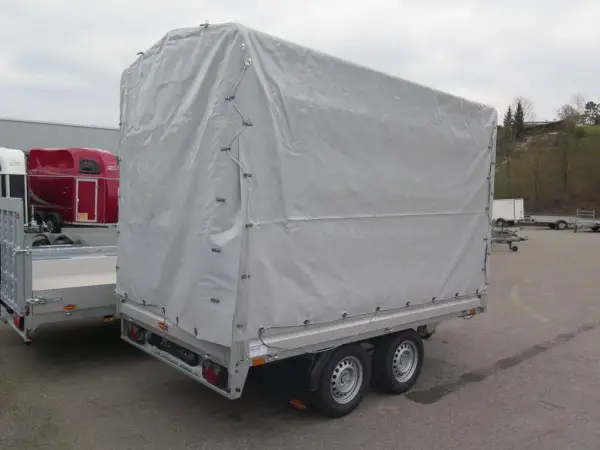 Preis inkl. Blachenaufbau mit ca. 180cm Innenhöhe, Blache (Blachenfarbe wählbar) auf allen vier Seiten zu öffnen (weiter Farben erhältlich). Stabiles verzinktes Fahrgestell,