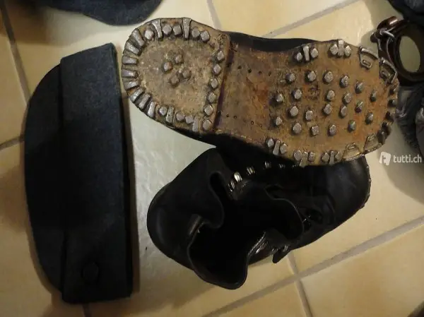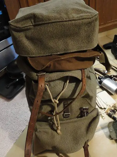 Besteck, Flickzeug, Putzzeug, genagelte Schuhe, Regenschutz, diverse Säcke,