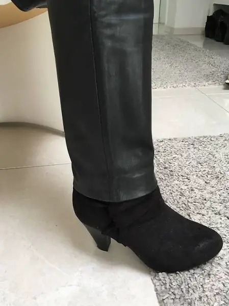 Leder. Mit Münzfach. Per me. Gr. S/36. Hüfthoch. Länge ab Hüfte 99 cm, Hüfte 36 cm, Bein unten 17 cm, schmal geschnitten. Saum könnte um 3 1/2 cm verlängert werden.