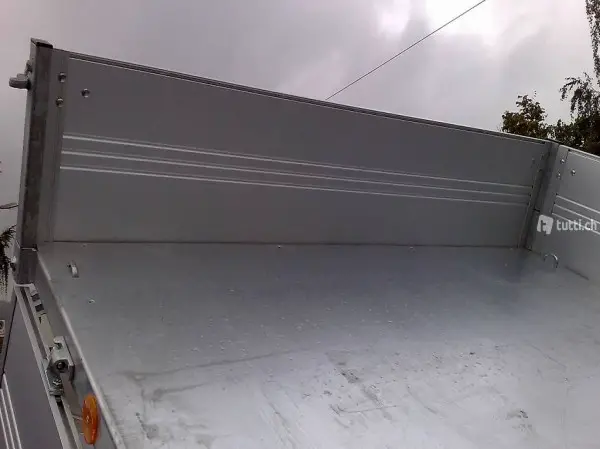 3mm Stahlboden feuerverzinkt, seitlich bis unter die Brücke umlaufend mit 4 Binderingen, Sicherungsstütze, Alu-Bordwände, alle vier Wände abklappbar, hinten auch pendelbar, alle 4 Eckpfosten abnehmbar. Stabiler feuerverzinkter Unterbau und Fahrgestell,
