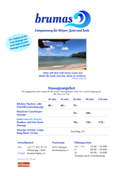 Massagen zum gleichen Preis - 60 min./80.-, 90 min./115.- und 120 min./150.--