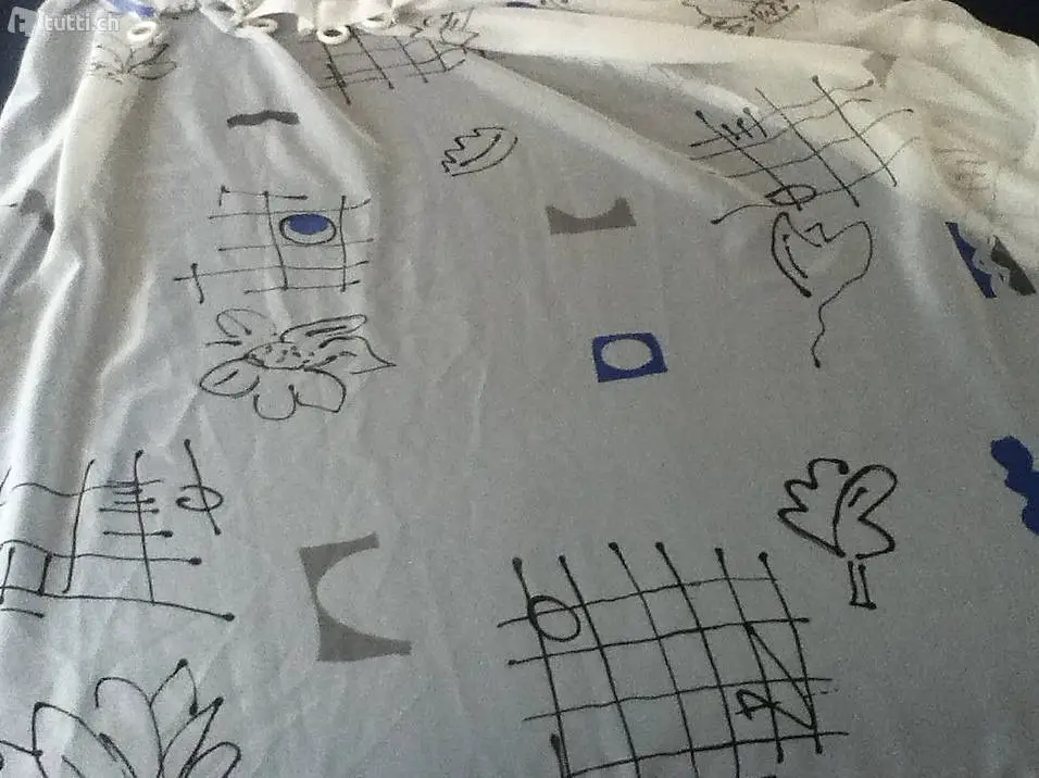 Vorhang 200 cm), Länge 125 cm, mit Ringen für Aufhängestange und Abschlussband (ähnlich einem Bleiband). Dieser Vorhang ist weiss, fein gemustert mit einem blau-grauen Dessin: