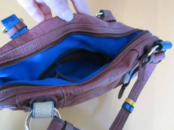 Sac à main bordeau, intérieur bleu avec poches - L. Credi