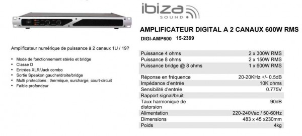Ampli digital 2X 300W IBIZA DIGI-AMP600 NEUF