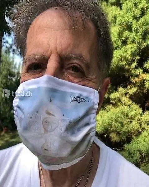 Polyesterstoffmaske, hergestellt in der Schweiz nach Originalwerken des Schweizer Gegenwartkünstlers JUEL, Sujet : Love Forever, 2 Stofflagen, aussen 205 g(100%Polyester Airtex , innen 65 g Filterlayer (70% Viskose, 30% Polyester) wiederverwendbar, waschbar bei 60 C , 4 farbig, Fr 18.- pro Stück + Versand