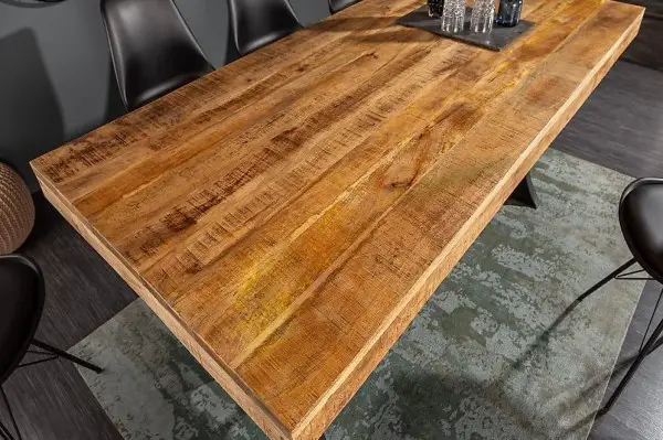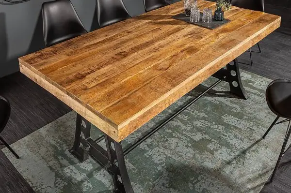 Tischplatte aus massivem Mangoholz wurde in authentischer Bohlen-Optik designt. Dadurch wirken die leicht abgerundeten Bohlen gemeinsam als einzigartige Tischplatte mit tollen, haptischen Eigenschaften. Den perfekten Abschluss bilden die stabilen Metallbeine im Industrial Look. Diese werden in Handarbeit veredelt und weisen so authentische Industrial Merkmale auf.