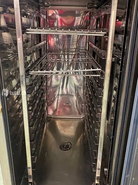 Doppelausführung Elektronisch programmierbar mit AUTOCLIMA, eine Lüftergeschwindigkeiten / Heizstufen. Aus Chromnickelstahl, mit direkter Dampfproduktion im Garraum, dieser ist trapezförmig, Kanten und Ecken abgerundet, daher reinigungsfreundlich, fugenlos verschweisst, Isolierung 35 mm, Türe mit doppeltem Sicherheitsglas.