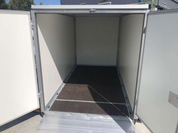 Hinten zwei Flügeltüren mit flacher Auffahrrampe aus Aluminium-Fahrzeugbodenprofil, Rampenlänge ca. 100cm