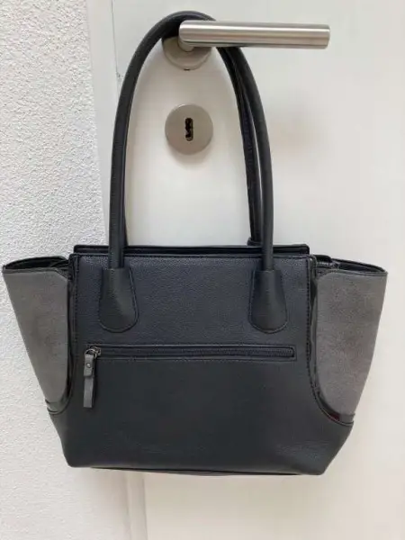 Schöne, schwarze Gabor-Handtasche. Seitlicher Einsatz dunkelgrau. Reissverschluss. Rückseite der Tasche mit Reissverschluss. Leder. Innen eine Reissverschlusstasche und zwei einzelne Fächer. Zusätzlicher, langer Träger. Leder