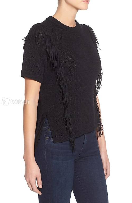 Curtains of swingy tape-yarn fringe add spirited attitude to a cottony-soft crewneck sweater styled with short sleeves and a vented high/low hem.