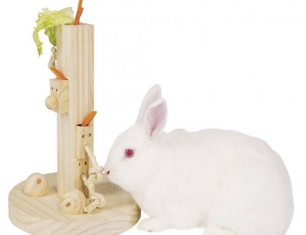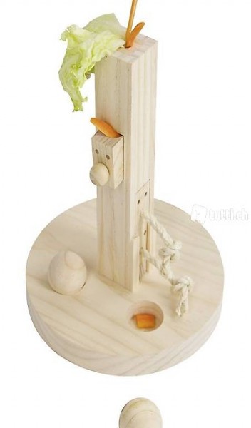 In dem Futterbaum können Kräuterdrops, Haferecken oder anderes Futter versteckt werden und die Kaninchen können dies dann in verschiedenen Schwierigkeitsstufen erarbeiten.