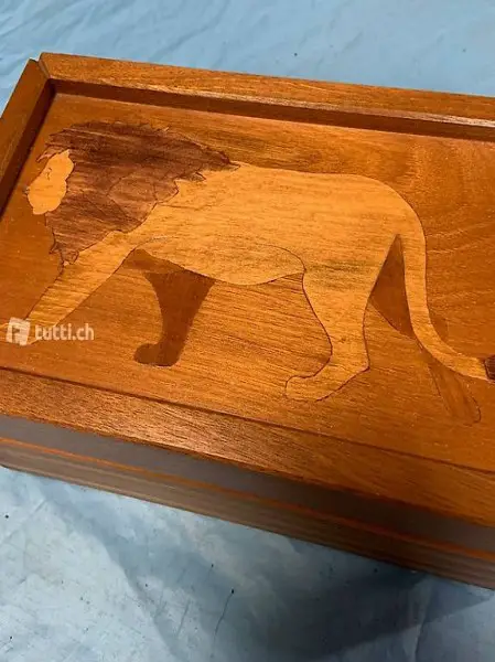 Sul coperchio c'è un intarsio creato a mano rappresentante un Leone