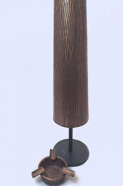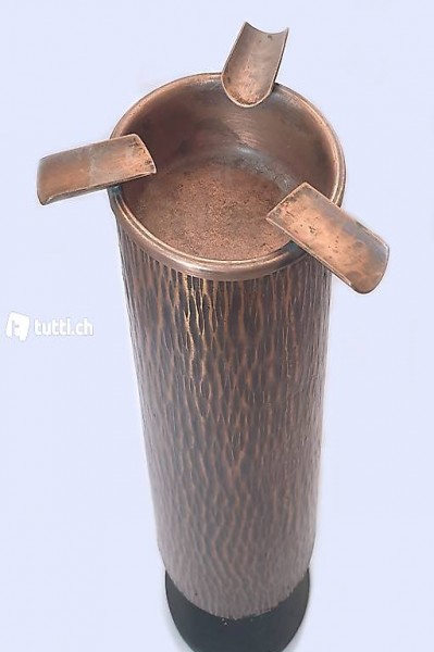 Der aus gehämmertem Kupferblech gearbeitete Standaschenbecher stammt aus den 60er-Jahre. Der Aschenbecherteil oben kann zum Enleeren und Reinigen entfernt werden und hat drei grosszügige Ablagehalterungen für Zigaretten und Zigarren.