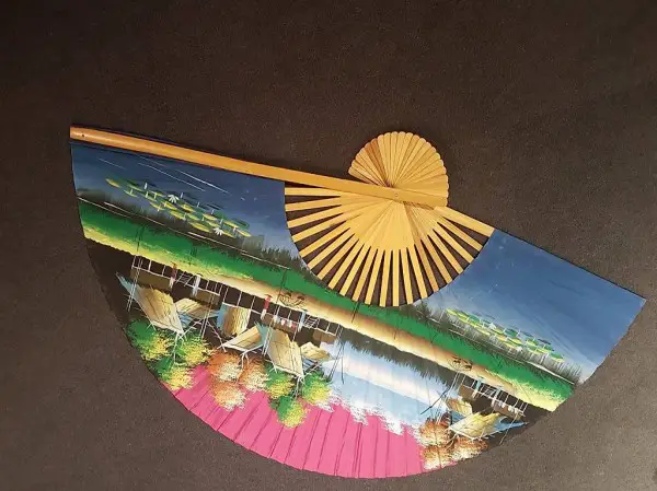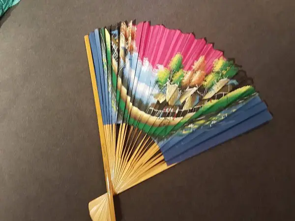 Asiatischer Wandfächer Bambusholz mit Landschaft Blau Rot.