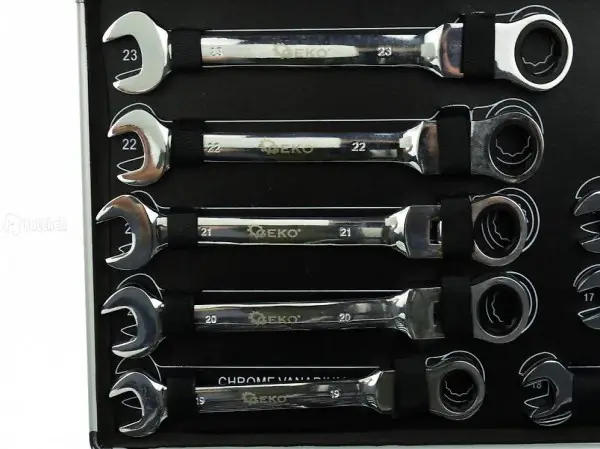 Das Set enthält 22-teilige Ratschen-Kombinationsschlüssel: 6, 7, 8, 9, 10, 11, 12, 13, 14, 15, 16, 17, 18, 19, 20, 21, 22, 23, 24, 27, 30 32 mm