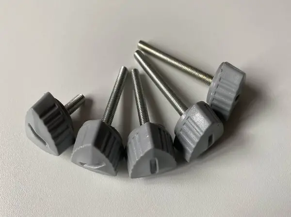 Sechs Verkleidungsschrauben mit schwarzem Kunststoffgriff.