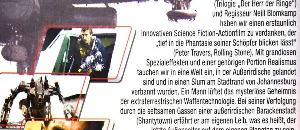 Raumschiff positioniert sich über Johannesburg. In einem Slum am Stadtrand erhalten die Ausserirdischen provisorisches Asyl. - Sie sollen jedoch umgesiedelt werden. - Lesen Sie bitte auch die Beschreibung auf der dritten Foto.