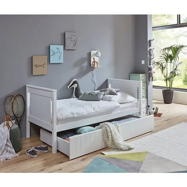 Das Etagenbett MIA aus dem Hause RELITA kann ebenfalls in Gestalt zweier Einzelbetten genutzt werden. Als Etagenbett genutzt spart es jedoch viel Platz im Kinderzimmer. Keine Angst vor dem Herausfallen! Die umlaufende Absturzsicherung des oberen Bettes gibt grossen und kleinen Kindern Sicherheit auf der oberen Etage. Die Leiter kann rechts oder links angebracht werden.