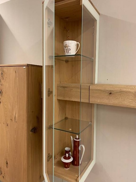 Glas, entsteht eine einzigartige Wohnstimmung - Die Natur wird in den urbanen Lebensraum geholt. Die Wohnkombination hat eine Gesamtbreite von 300 cm. Sie haben ein Wandhängeelement links mit 2 Innentablare. Eine kleines Vitrinenelement, welches ebenfalls an die Wand geschraubt ist. Speziell ist das der Balken durch die