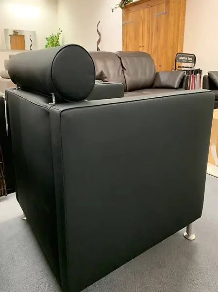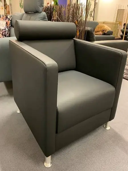 Raum. Formschön als Gegensatz zur kubischen Form des Sessels, besticht die runde Kopfstützenrolle, die Sie in der Höhe wie im