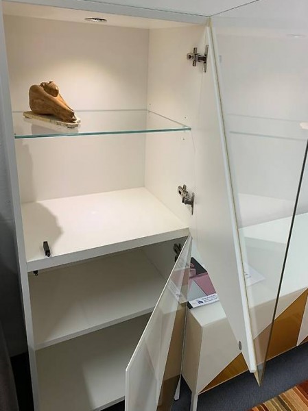Beleuchtung, damit Ihr Gegenstand, den Sie speziell hervorheben wollen schön zur Geltung kommt. Unten ist dann eine undurchsichtige Türe mit einem Innentablar. Das Lowboard hat 2 Schubladen sowie eine Klappe mit Kabeldurchlass, damit Sie elektronische Geräte mühelos mit dem TV verkabeln können. Die Vitrine sowie das Lowboard haben Glasabdeckungen und Glasfronten und sind elegant auf zierliche Füsse gestellt.
