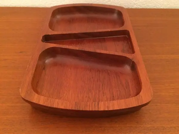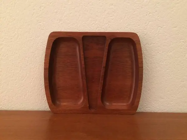 Holz gefertigt und verfügt über 3 Fächer. Die Aufteilung eignet sich super um die Schale als Nusschale einzusetzen: in der Mitte ist Platz für den Nussknacker, eine Seite kann für ganze Nüsse gebraucht werden, die andere für geknackte. Das Holzschälchen befindet sich in gutem gebrauchten Zustand.