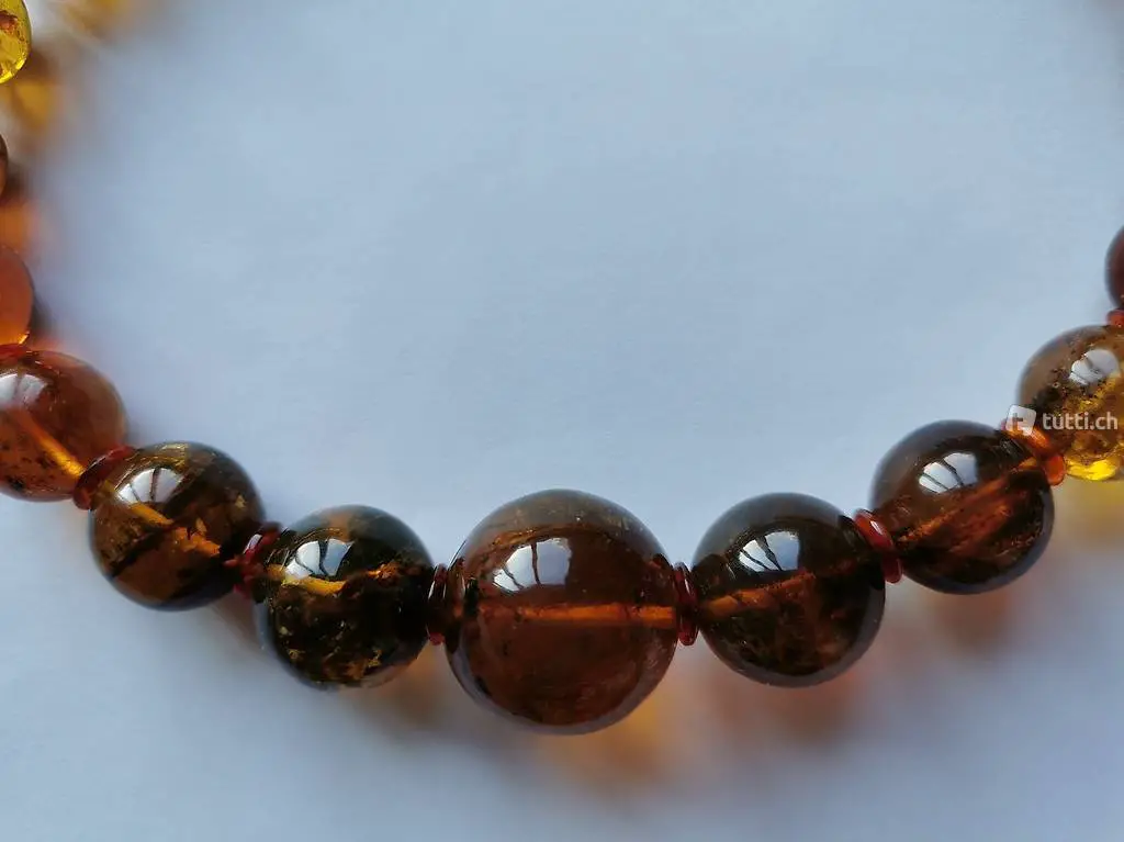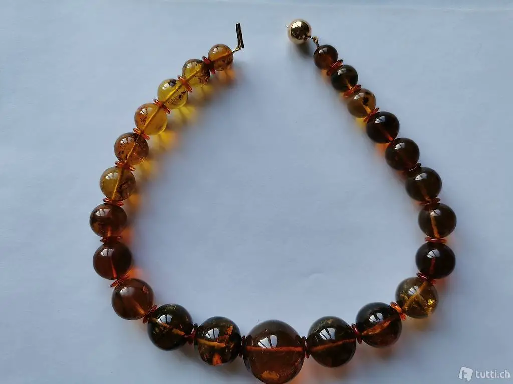 , neu aufgezogen (Kugeln und zum Schutz dieser Kugel Bernsteinplättchen dazwischen), Verschluss 18 Karat Gold, 46 cm lang,