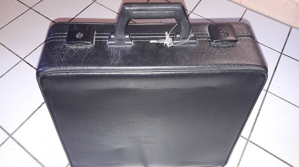 einfacher, schlichter Aktenkoffer oder Werkzeugkoffer, zwei Schlüssel und eine Seitenpochette, 44cm×36cn×13cm, in schwarzem Kunstlederlook