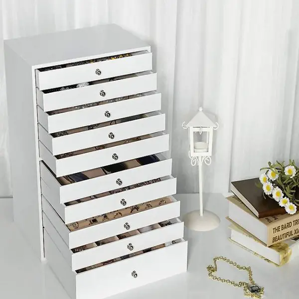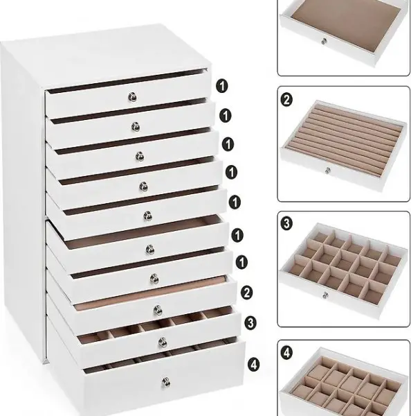 Schmuckschatulle besteht aus MDF-Platten (Klasse E1), die lange Lebensdauer und genug Gewicht erzeugen. Unerwünschtes Verrutschen und Umkippen werden verhindert