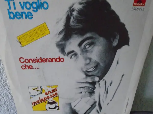 1980, Enzo Malepasso, Komponierte viele Songs für andere Berühmte Künstler. Eine Stimme wie Lucio Battisti wurde zweit platzierter am Sanremo Festival mit, Ti voglio bene, B Seite, Considerando che. Hand Signiert von einem Auftritt im Kino Rex in Locarno. Platte ist Gereinigt.