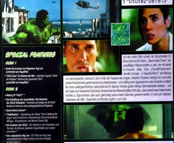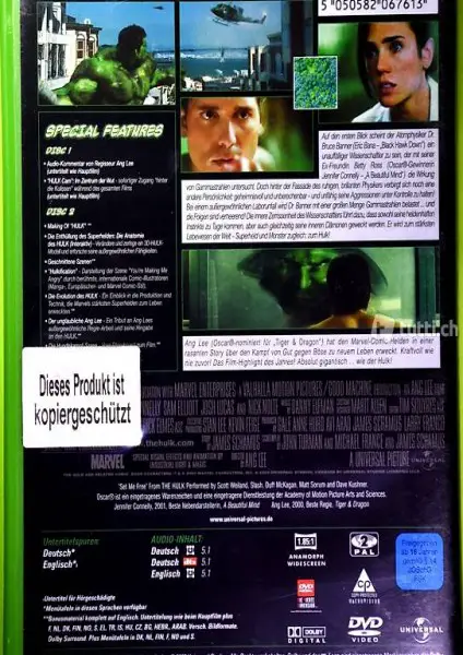 Zögern Sie nicht - treten Sie mit mir in Kontakt. - Schon in ein paar Tagen können Sie sich, während ca. 133 Minuten, an der actiongeladenen Hulk-Geschichte erfreuen. - Auch das Zusatzmateriel (über 2 Stunden) ist interessant und durchaus sehenswert.