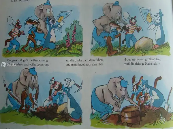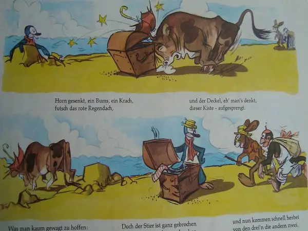 Eine bunte Bild- und Versgeschichte von Cefischer (= Carl E. Fischer). Querres kartoniertes Bilderbuch von 32 Seiten. Erschien 1979 (3. Auflage) im Dennoch Verlag Stegmann, Deisenhofen.