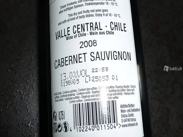 1 Flasche Rotwein Cabernet 2008 aus Chile.