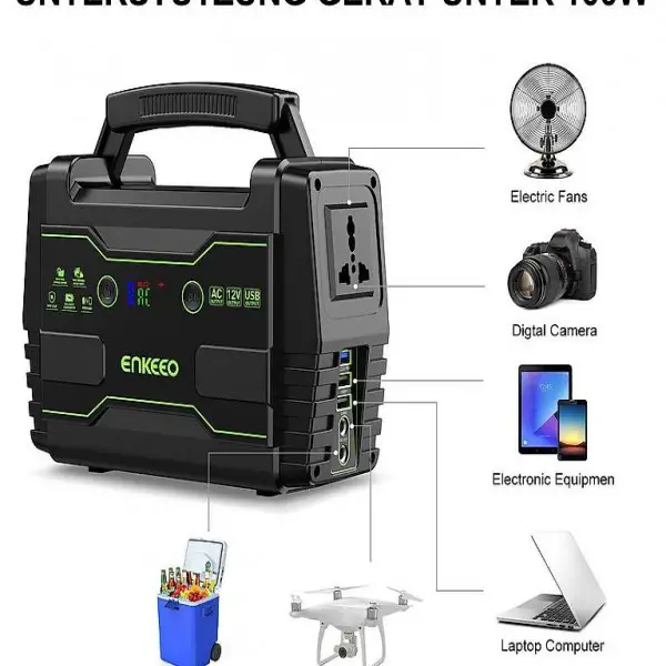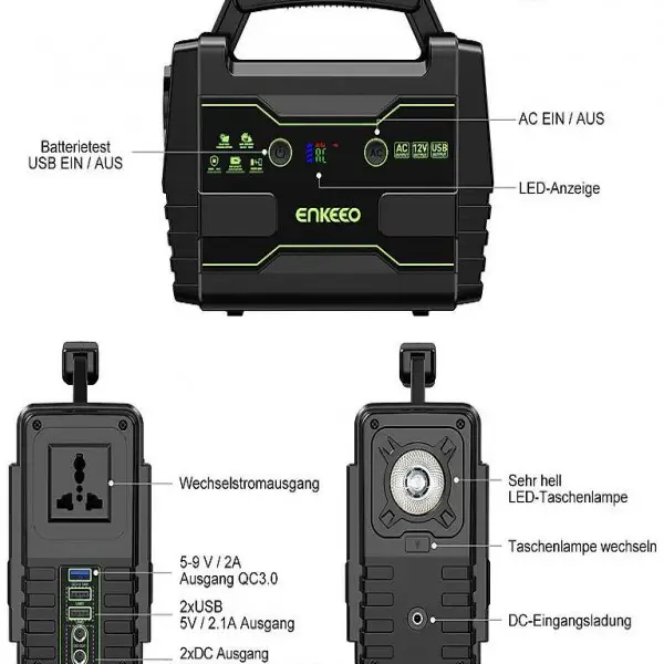 AC / DC / QC3.0 USB-AUSGÄNGE: mit 1 x AC-Anschluss (max. 150 W) ausgestattet; 2 x DC-Anschlüsse (12 V / 10 A, max. 15 A); 1 x USB QC3.0 (5-9V / 2A) und 2 USB-Anschlüsse (5V / 2.1A); Laptops, Telefone, Kameras, Lüfter und andere elektronische Geräte und Geräte laden
