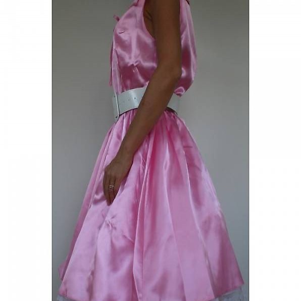 Das rosa Kleid ist aus glänzendem Polyester gefertigt. Das schulterbetonende Dekor wird stilvoll über der Brust zusammengeschnürt. Ein angedeuteter Petticoat ist eingenäht.