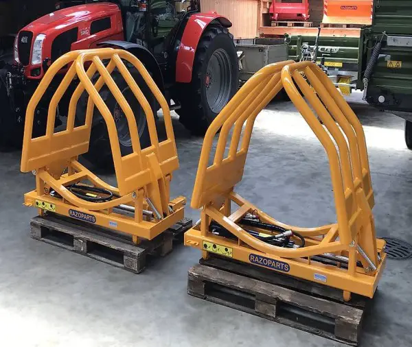 Hydraulische Folienballenzange RAZOPARTS für Rundballen von 0.80 - 1.60 Meter. Tragkraft 1'200 kg. 2 bewegliche Greifarme federzentriert. EURO-8 Aufnahme für Frontlader. Sehr schonende Folienbehandlung. Am Traktor-Frontlader sind Euro 8 Aufnahme und 1 DW-Ventil nötig.