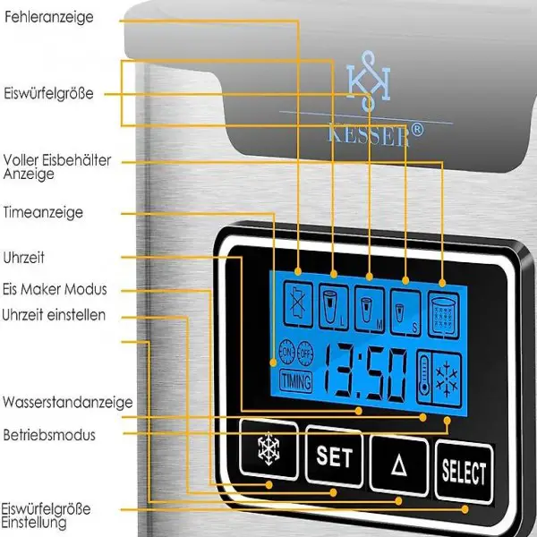EINFACHE BEDIENUNG: Bedient wird der Eiswürfelbereiter über 4 Tasten direkt unter dem Display. Grosse, leicht verständliche Symbole machen jederzeit klar, welcher Betriebsmodus eingestellt wurde. Hier lässt sich auch der Ein-/Ausschalt-Timer programmieren.