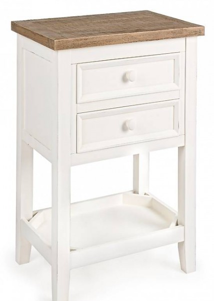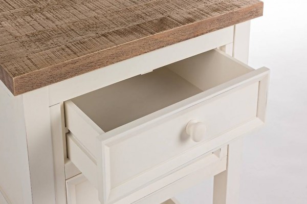 Nachttisch / Beistelltisch ELVIA im Stil von Landhaus / Shabby Chic mit 2 kleinen Schubladen und einer Ablagefläche. Die Abdeckplatte ist aus naturbelassenen Holz.