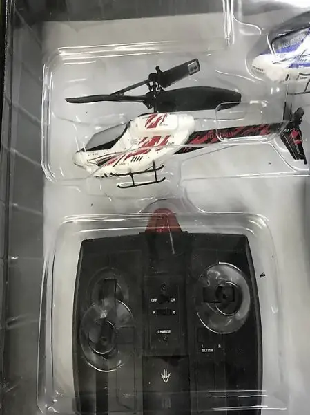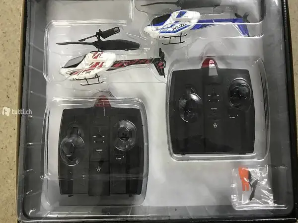 Komplette anlage mit 2 Helikoptern und 2 Funkfernbedienungen und Laser Attack System. Es können 2 und mehrere gegen einander Spielen. Wenn getroffen geht der getroffene zu Boden und muss erst wieder gestartet werden. Mit akustischem Aktion System. Alles funktioniert tadellos und ist neu uns ungebraucht.