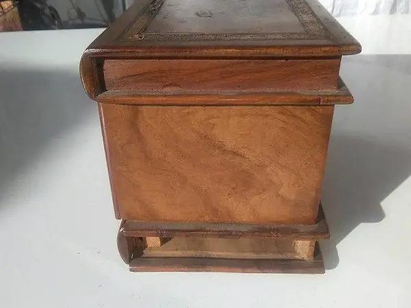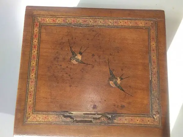 Edel-Holz-Bücher-Schatulle mit Geheimfach. Ca. 19. Jahrhundert. Mit römischen Zahlen. Deckel mit Einlegearbeiten, Motiv Schwalben. Intarsien (Mikromosaik). Teilweise hat das Mosaik kleine Schäden (siehe Foto). Schloss kann repariert werden. Schlüssel fehlt. Holzleiste auf einer Seite fehlt (siehe Foto). Masse: L16cm × T12cm × H11,5cm. Liebhaberstück. Gebraucht. Zustand gemäss Beschreibung. Abholung, Barzahlung. Versand auf Anfrage.