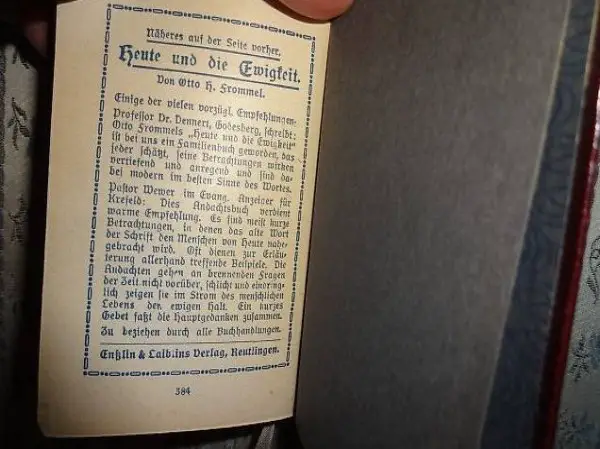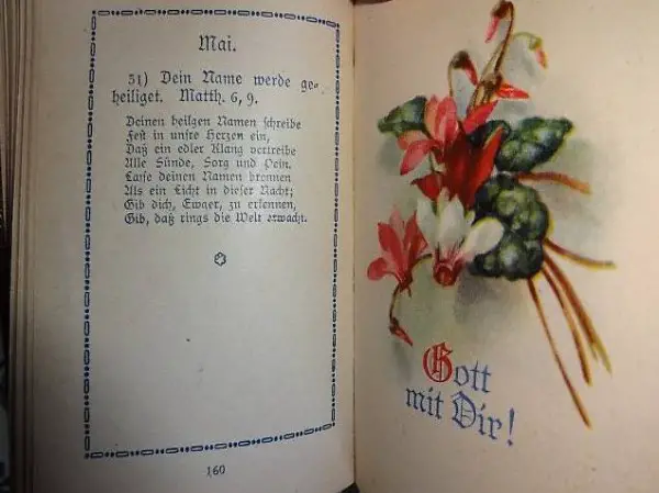 christliches Vergissmeinnicht, mit Widmung von 1928, für jeden Tag ein neuer Bibelspruch, sehr gut erhalten, mit Goldrand, 384 Seiten, Masse: 7 cm x 10 cm, dick 2.5 cm