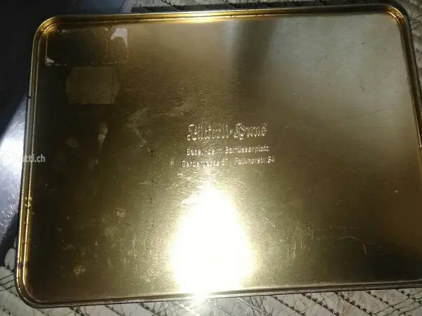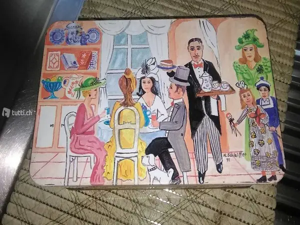 Bisquit-Blechdose vom Läckerli-Huus, Basel. Bildmotiv im Cafe von N. Schleiffer 91. Masse: H 7cm, B 14cm, L 22cm. Gebraucht, guter Zustand. Abholung, Barzahlung oder Versand gegen Kosten.