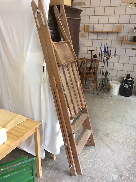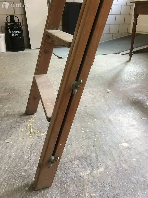 Alte Leiter aus Holz. Gesamthöhe ca 1800mm , Trittplatte Höhe 1300mm, einseitig 2 Holmen höhenverstellbar (für zB Arbeiten in Treppenbereiche). Sehr guter Zustand trotz den ca 60 Jahre
