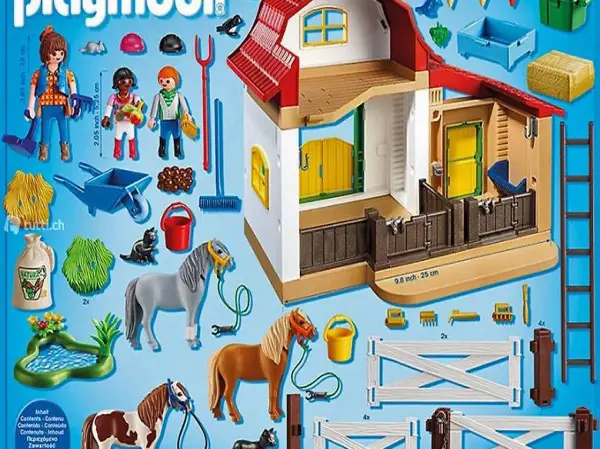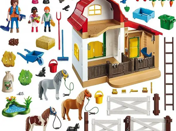Playmobil dans la série Country. L'ensemble comprend trois personnages, une femme, un garçon et une fille. Les trois poneys sont tenus dans la boîte simple et la boîte à deux. Pour limiter le parc, la barrière flexible se compose de sept éléments de clôture. Dans le grenier, les nombreux accessoires alimentaires tels que les meules de foin et les sacs à céréales se placent.