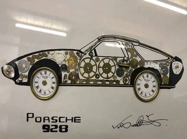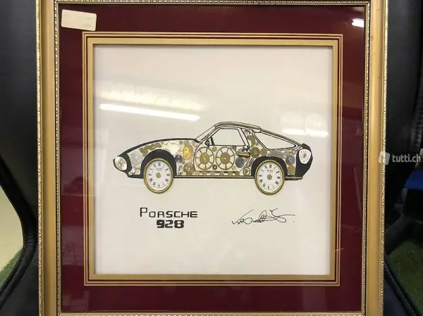 BILD VON PORSCHE 928 AUS UHREN TEILE. VON KÜNSTLER:KEN BROADBENT AUS ENGLAND. MIT SIGNATUR. PREIS 180.- GRÖSSE: 38 CM X 34 CM. TEL: 079 380 09 90.