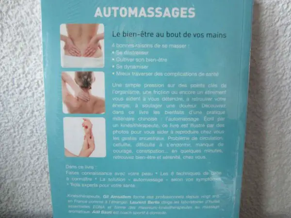 4 bonnes raisons de se masser : Se déstresser, Cultiver son bien-être, Se dynamiser. Mieux traverser des complications de santé. Une simple pression sur des points clés de l'organisme, une friction ou encore un étirement vous aident à vous détendre, à retrouver votre énergie, à soulager une douleur. Découvrez dans ce livre les bienfaits d'une pratique millénaire chinoise : l'automassage. Écrit par un kinésithérapeute, ce livre est illustré par des photos pour vous aider à reproduire chez vous les gestes ancestraux. Problème de circulation, cellulite, difficulté à s'endormir, manque de courage, constipation... en quelques minutes, retrouvez bien-être et sérénité, chez vous.