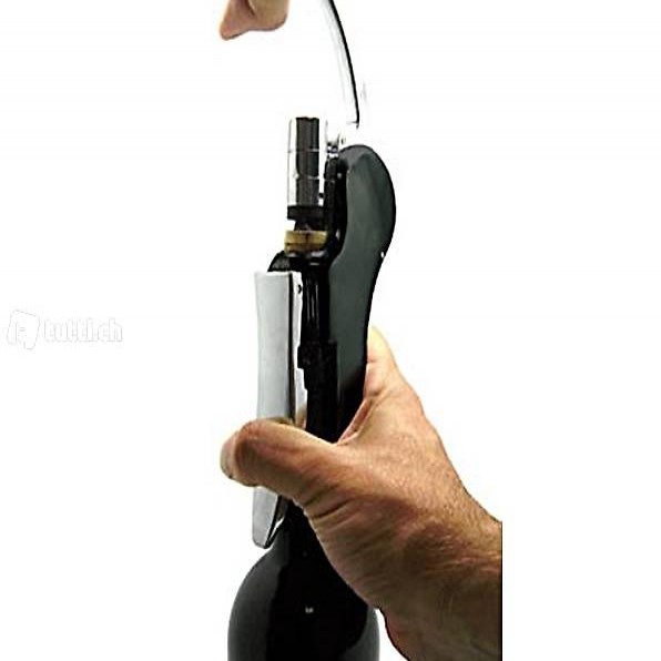 Der praktische Hebelflaschenöffner, für müheloses und schnelles Entkorken, sehr einfach in der Anwendung: Flaschenöffner aufsetzten, Habel nach unten drücken und wieder hochziehen: Flasche ist entkorkt. Nochmals nach unten, Hebel zusammendrücken und wieder hochziehen: Korken ist von der Spirale gezogen