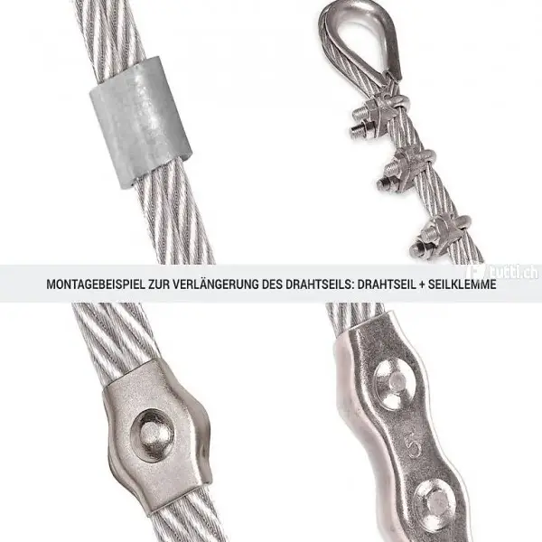 Lieferumfang: Drahtseil 5mm 6x7 verzinkt, 4x Spannschloss M8 Haken+Öse, 16x Kausche, 16x Bügelformklemme - SET 6